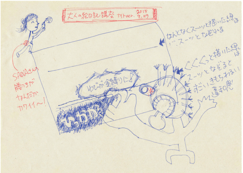 | 「講座の後も自分で絵日記を書くようになり、さらに効果を実感しています。心に変化が起きたのか、ここ数年仕事に追われて失っていた趣味や創作意欲が復活し、日常まで変わってきました。」 |