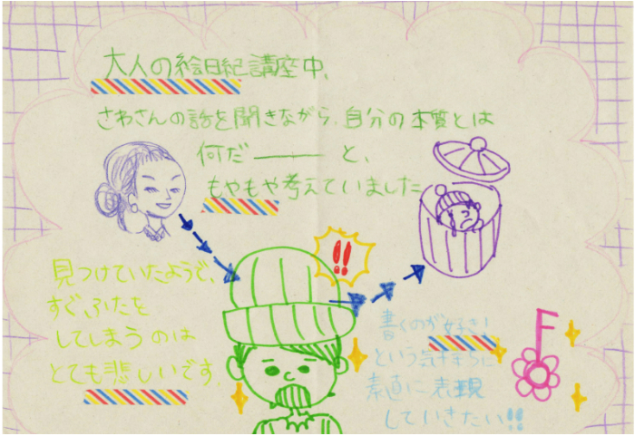 | 「日記は元々書いていましたが、絵を入れてみたら言葉だけの時には隠れてた子供の自分が出てきたんです。普段の真面目な日記とは全然違うものが完成して、私ってこんなこと思ってたのかと驚きました。」 |